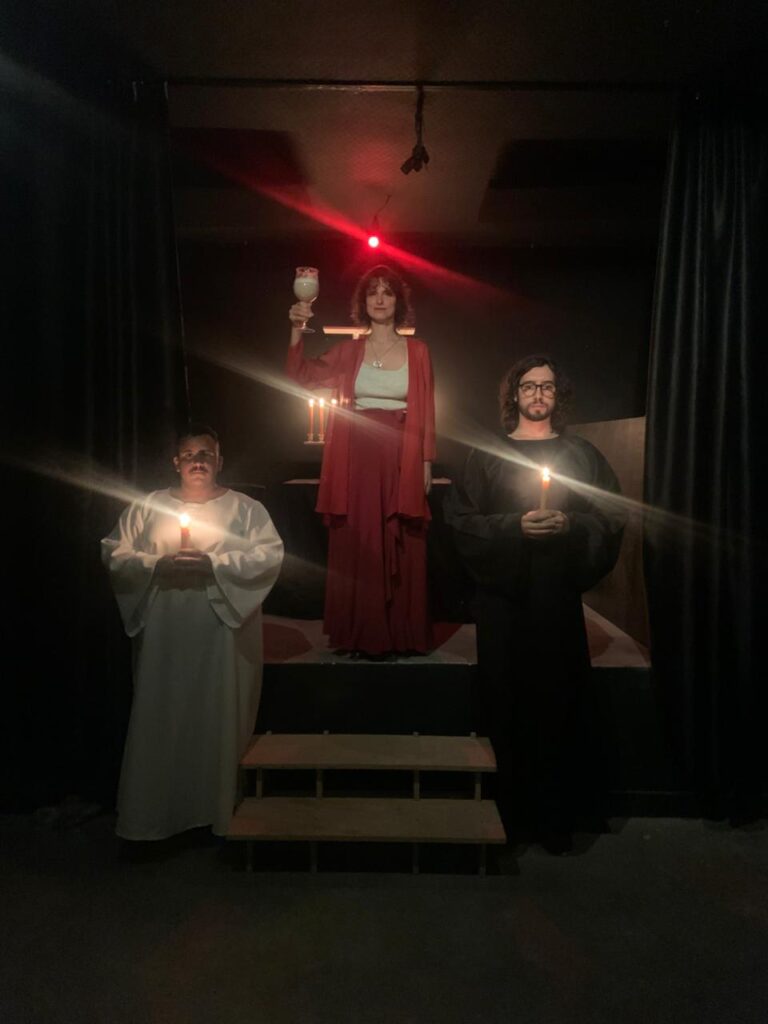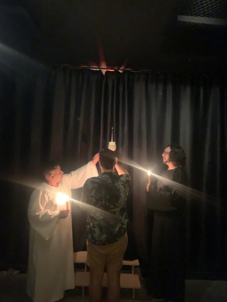 While chanting continues, Lion introduces each congregant singly to the shrine, without opening the veil. Within the shrine, Mater Coeli offers each congregant a cup of Milk in exchange for the candle. She extinguishes the candle as the Milk is drunk. Each congregant exits from the western side of the shrine, assisted by the Eagle, who cues the Lion to admit the next one. The Lion and Eagle pass through last of all, in that order.