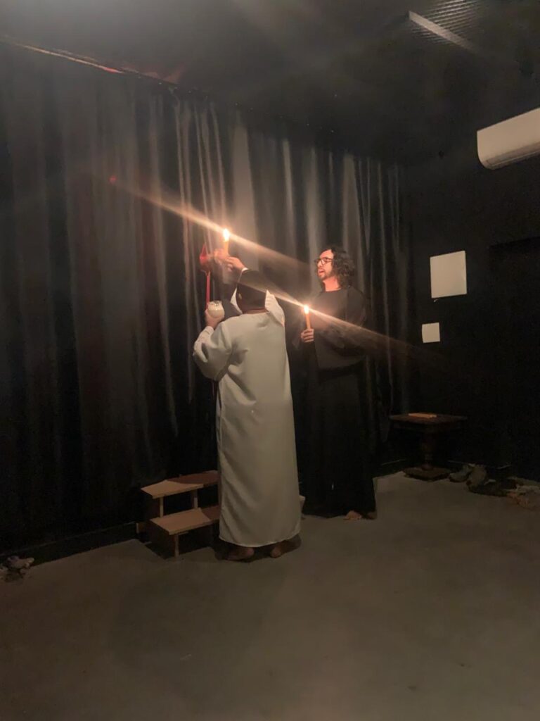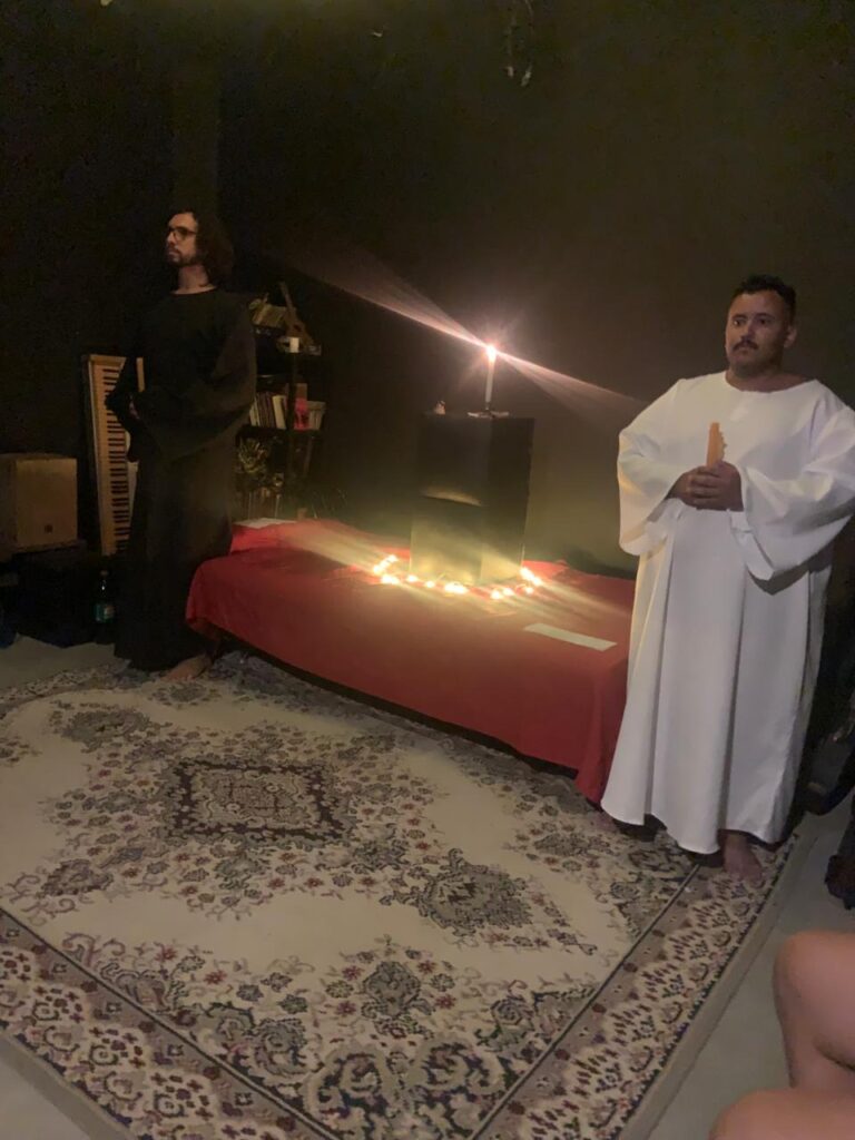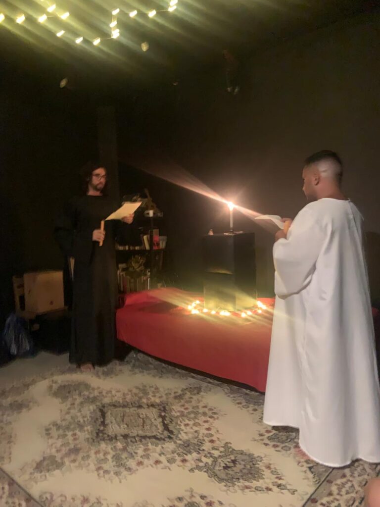 In Solar South, double-cube on dais, set with a burning taper, bell, and Book of the Law. Officers Eagle (in black) and Lion (in white) flank the altar, Eagle to East.